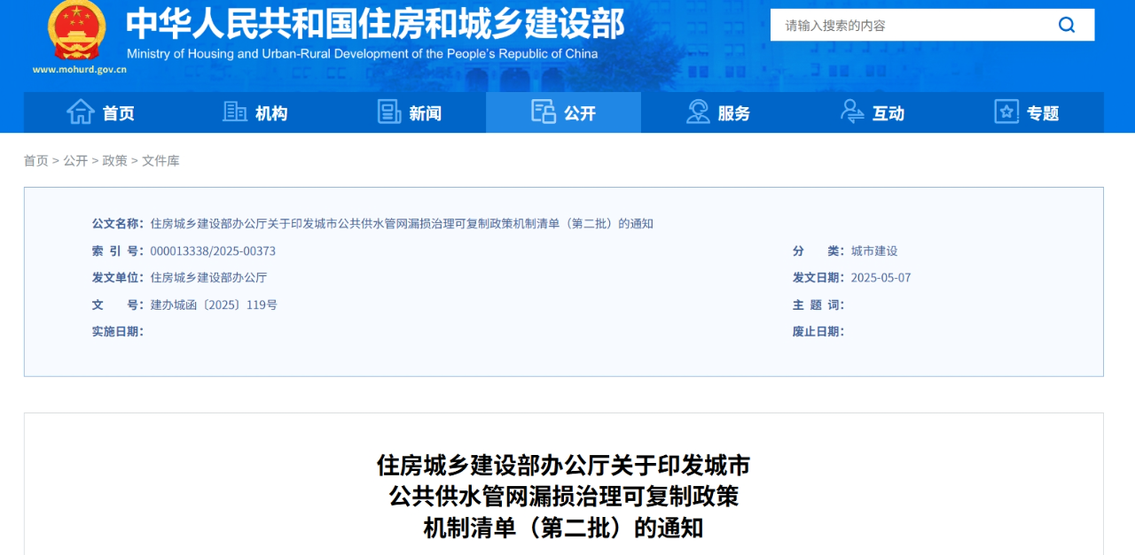 為加強城市公共供水管網(wǎng)漏損治理,健全長效機制,近日,住房城鄉(xiāng)建設(shè)部、國家發(fā)展改革委遴選了50個城市和縣城重點推進,梳理形成了城市公共供水管網(wǎng)漏損治理可復(fù)制政策機制清單(第二批)。